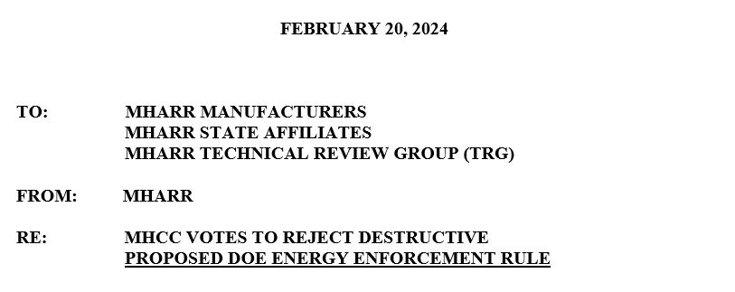 The statutory Manufactured Housing Consensus Committee (MHCC) following a two-day teleconference meeting, voted on February 16, 2024 – as urged by MHARR — to reject the proposed manufactured housing energy standards enforcement rule published by the U.S. Department of Energy (DOE) in the Federal Register on December 26, 2023.